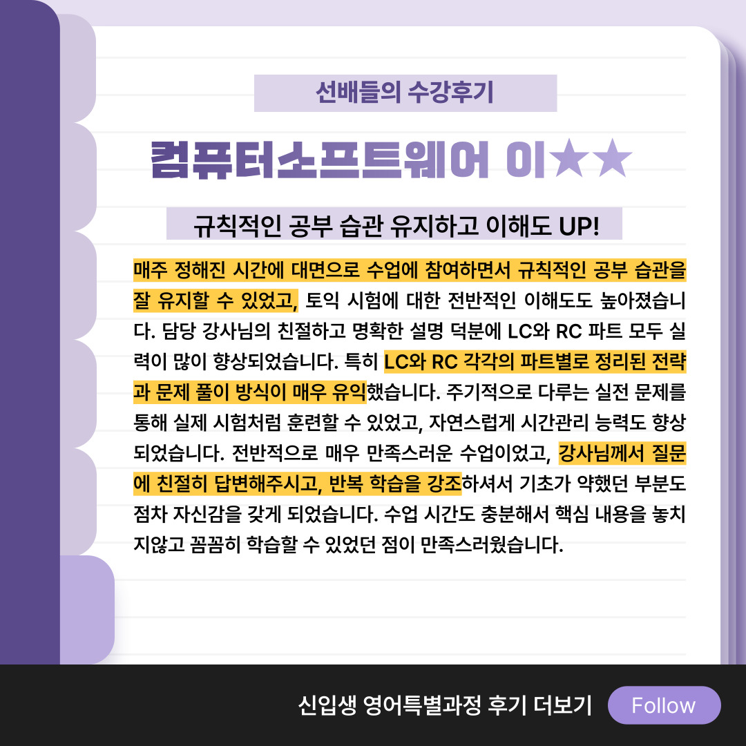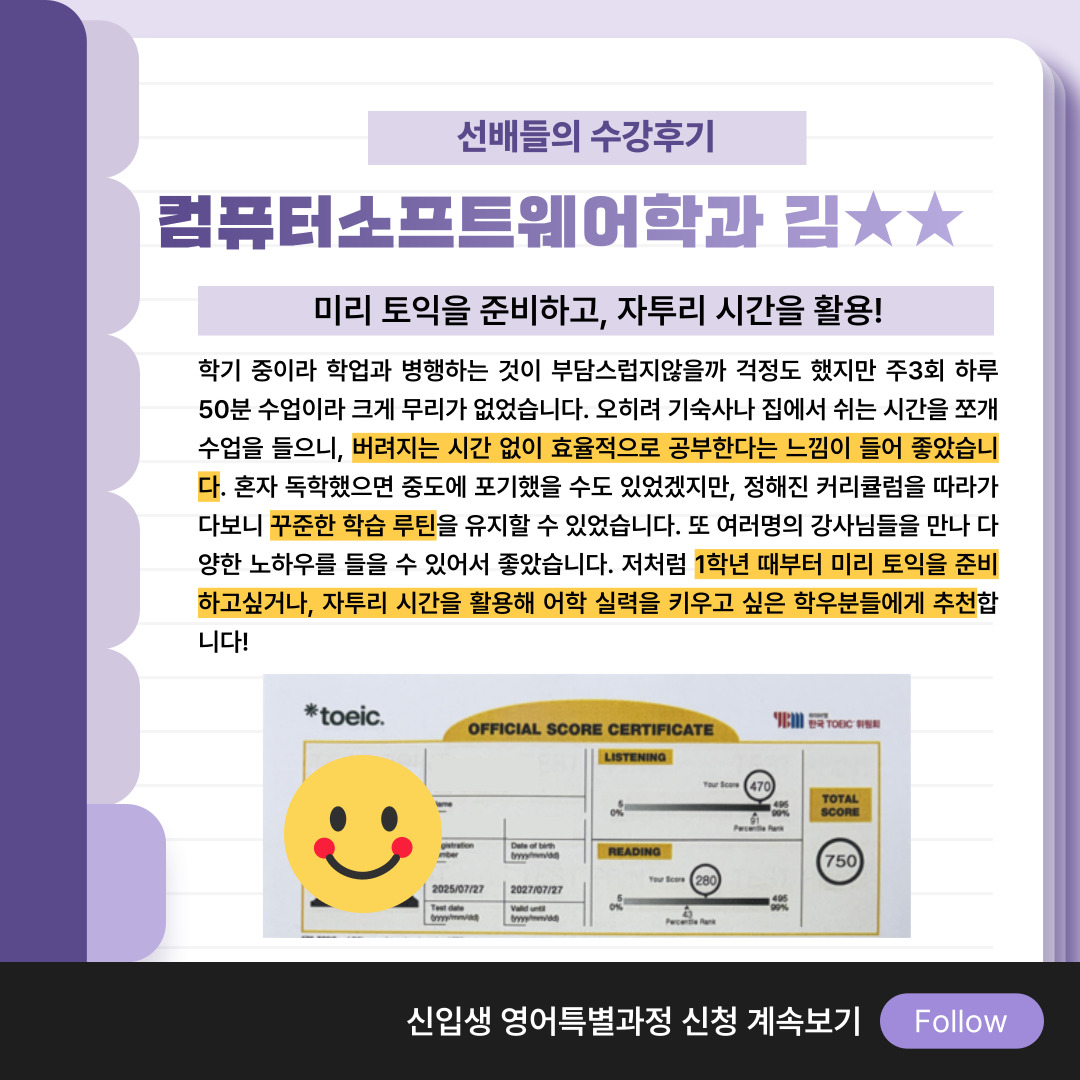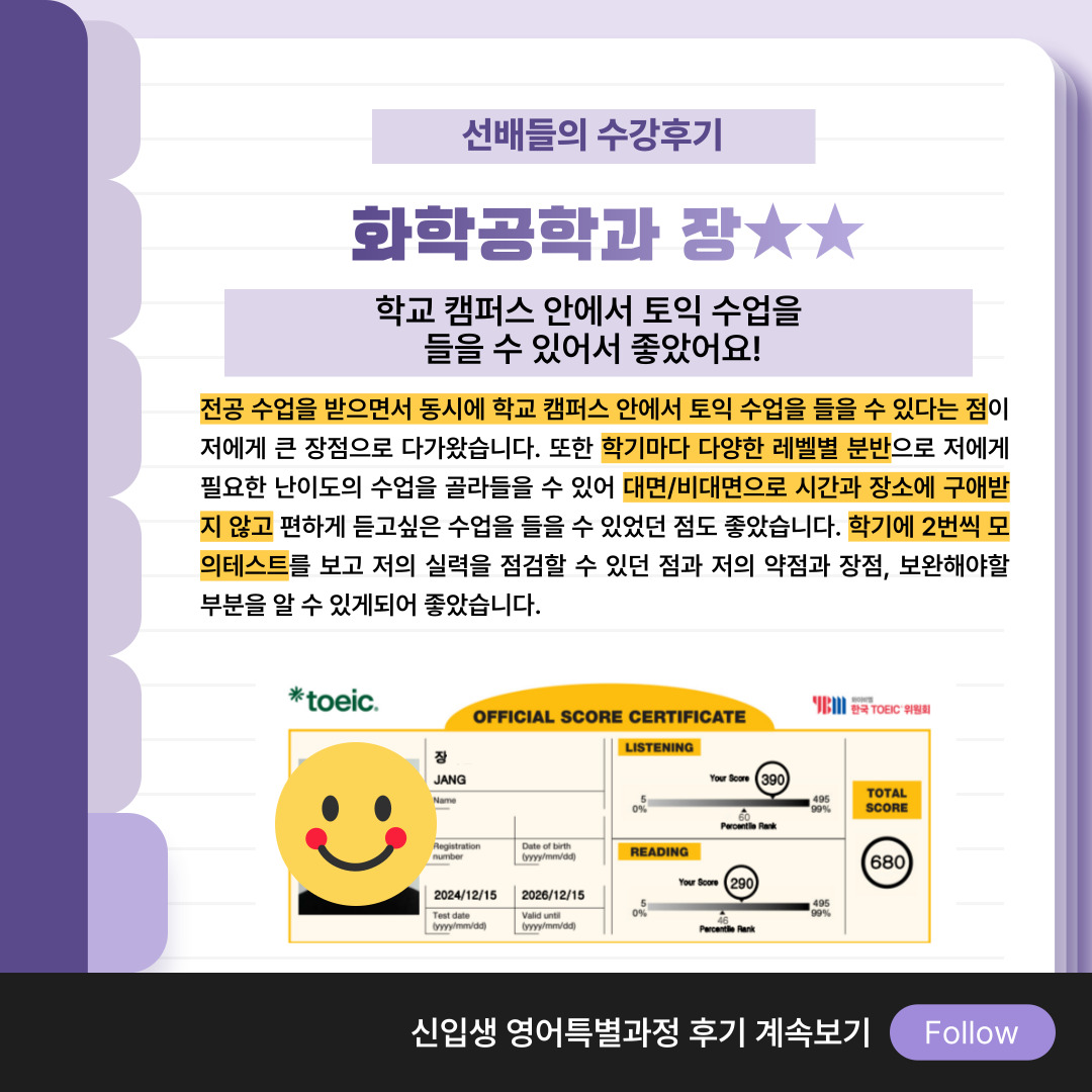 학교 캠퍼스 안에서 토익 수업을 들을 수 있어 좋았어요!